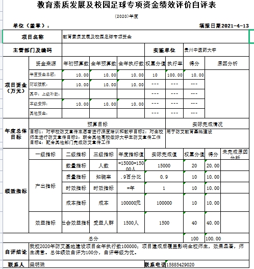 根据年初设定的绩效目标,本项目已完成全部(或部分)目标任务,自评得分为100分。发现的主要问题及原因:一是受疫情影响,在防艾基地举办活动不多;二是未充分利用好线上宣传平台进行宣传。
