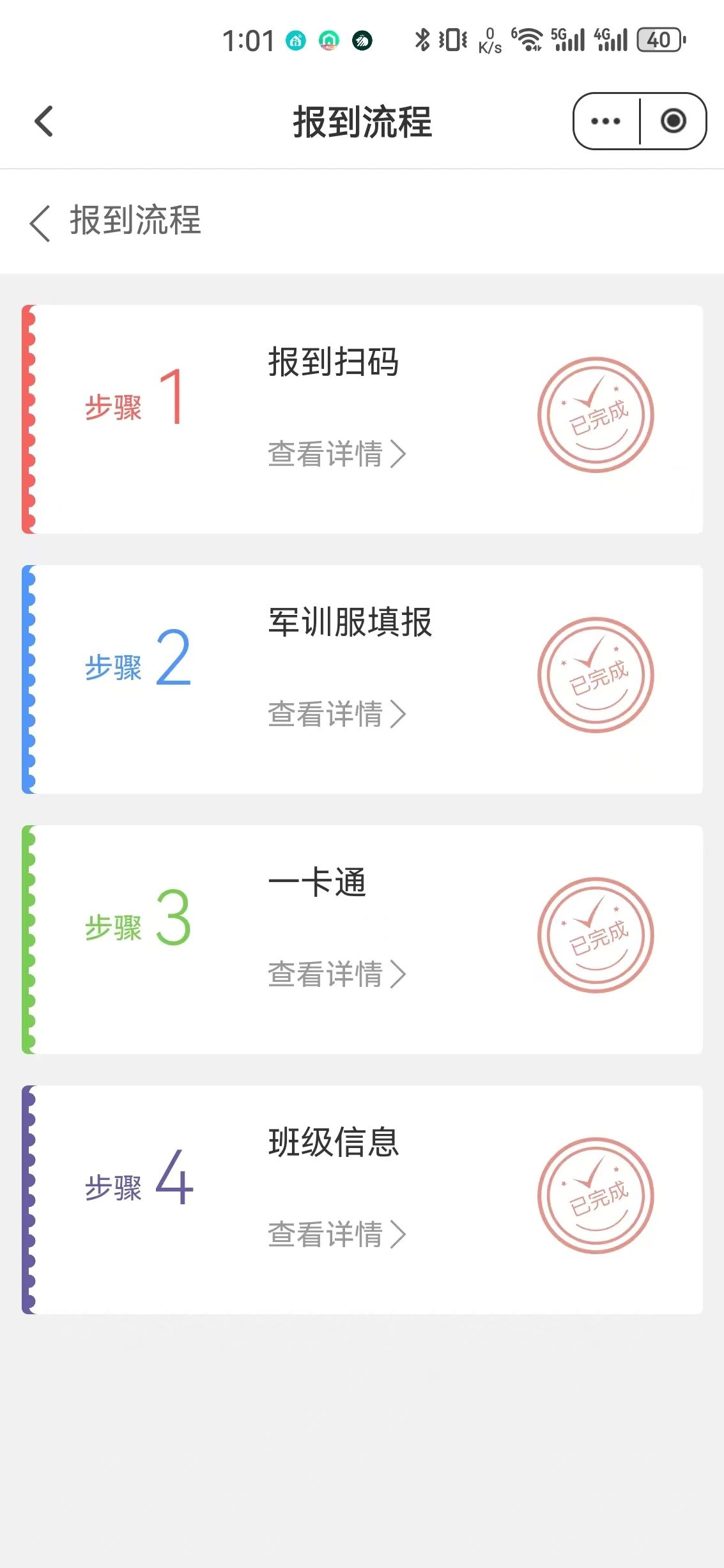 1、通过“易校园”APP扫码签到功能,扫描新生二维码。扫码确认后会有“已完成”图标,所有项目完成后均有确认图标,即表示完成报到。