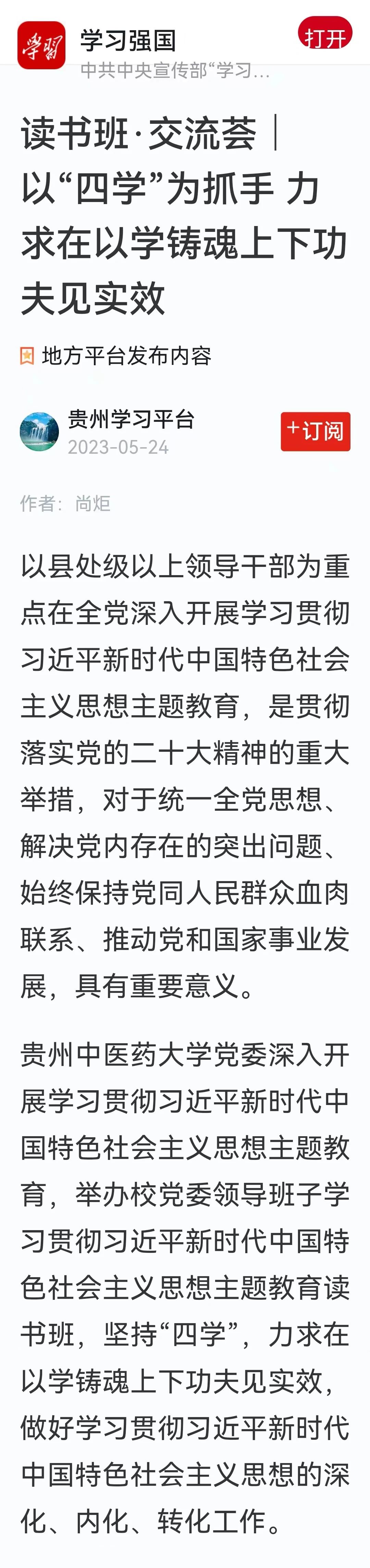 联系实际学,突出“三个结合”。除了党中央确定的8种学习材料外,读书班突出“三个结合”,把学习贯彻习近平新时代中国特色社会主义思想主题教育与党的二十大精神结合起来,用党的创新理论武装头脑;把学习贯彻习近平新时代中国特色社会主义思想主题教育同习近平总书记对贵州工作重要指示批示精神结合起来,加快推动学校发展,为贵州经济社会发展作出贡献;把学习贯彻习近平新时代中国特色社会主义思想主题教育同习近平总书记关于教育的重要论述和对中医药工作作出的重要指示精神结合起来,汇编成册,为助推学校高质量发展,中医药事业发展提供智力支持。